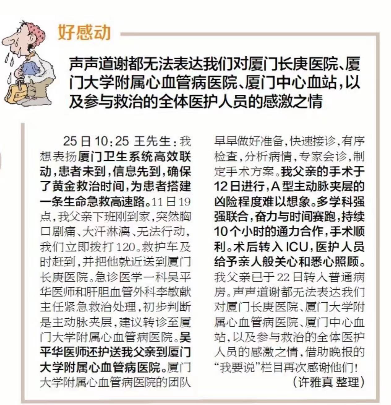 2024-04-30厦门晚报|声声道谢都无法表达我们对厦门长庚医院、吃瓜网 、厦门中心血站,以及参与救治的全体医护人员的感激之情 -