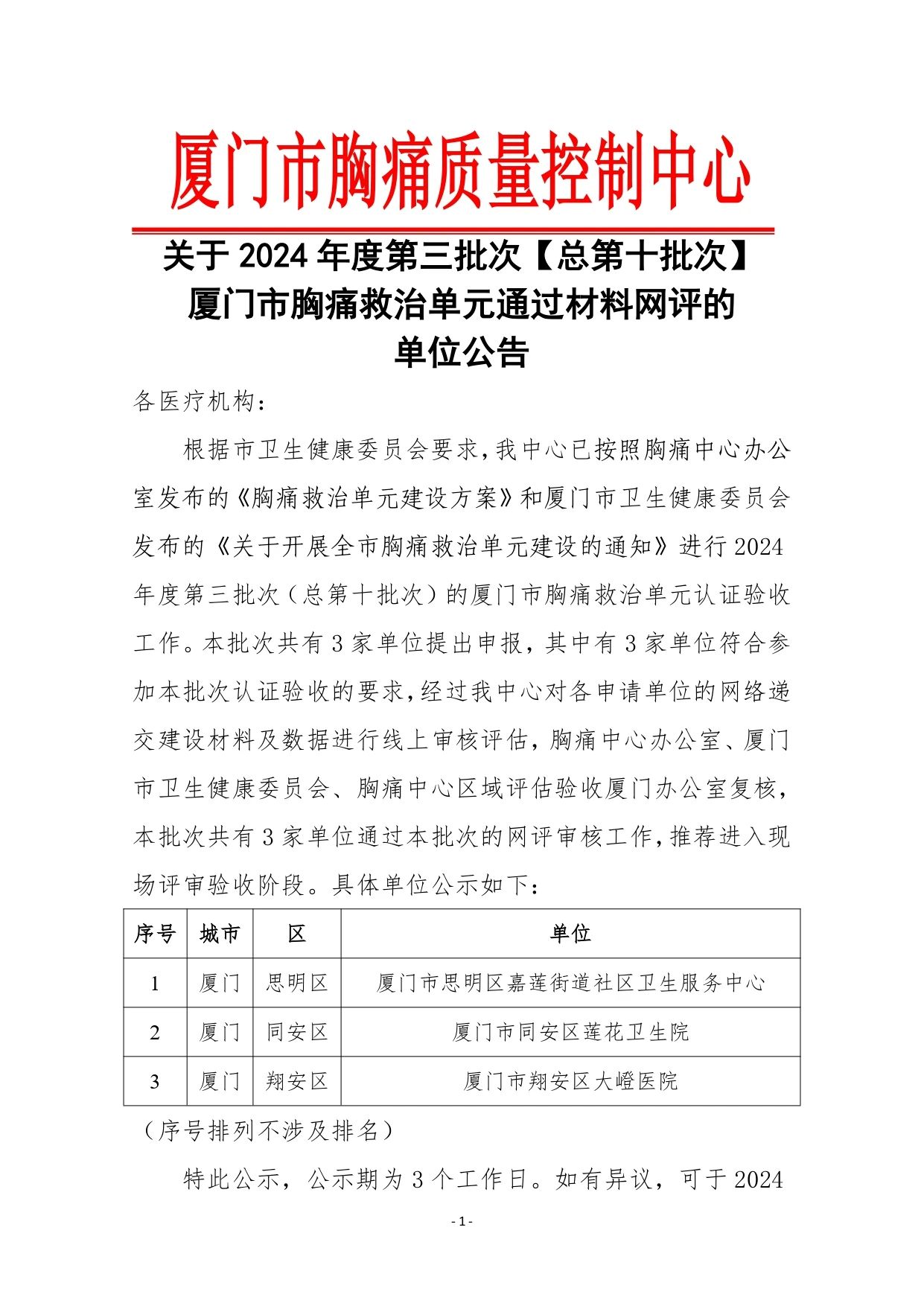 重要通知 | 关于2024年度第三批次(总第十批次)厦门市胸痛救治单元通过材料网评的单位公告